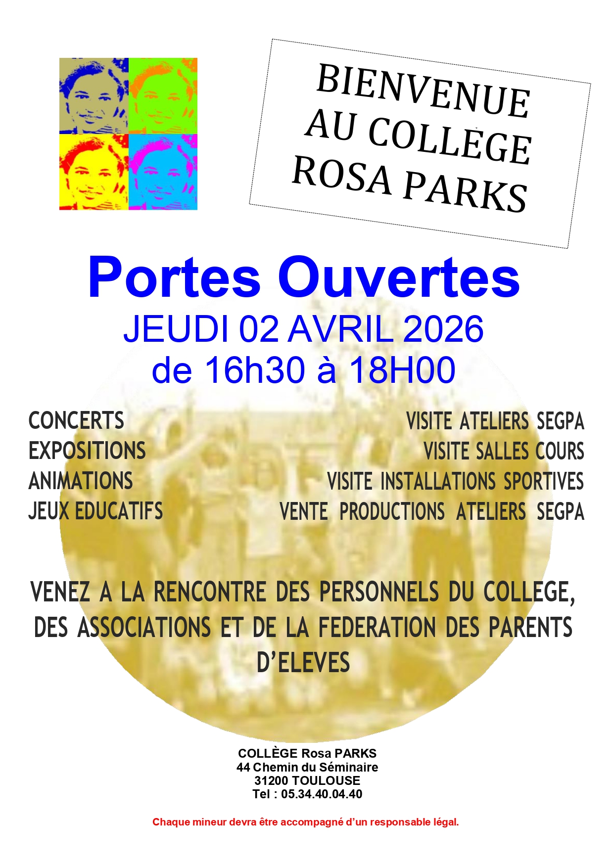 Journée portes ouvertes au collège Rosa Parks le jeudi 02 avril 2026 de 16h30 à 18h00.