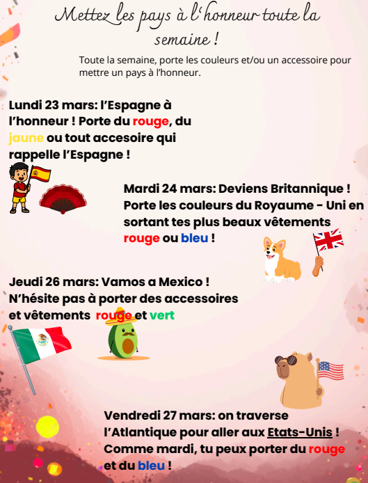 Chaque jour sera associé à une couleur représentant un pays ou un continent. Élèves et personnels sont invités à jouer le jeu en adaptant leur tenue.