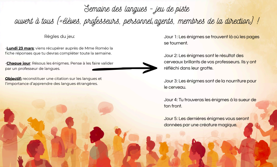 Du 23 au 27 mars, notre collège se met à l’heure internationale à l’occasion de la Semaine des langues ! Une belle opportunité pour découvrir d’autres cultures, s’ouvrir au monde et célébrer la diversité linguistique dans une ambiance conviviale et festive.
